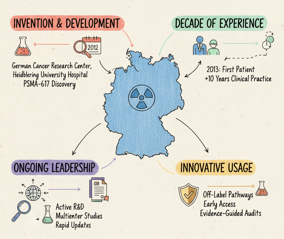 The main fact patients should know is that Germany isn’t just delivering Lu-177 PSMA—it helped invent it back in 2012.[6] PSMA-617, the small molecule behind Pluvicto, was developed by the German Cancer Research Center in collaboration with Heidelberg University Hospital. Based on this discovery, German clinics have been treating patients since 2013, giving the ecosystem over a decade of hands-on experience so far.