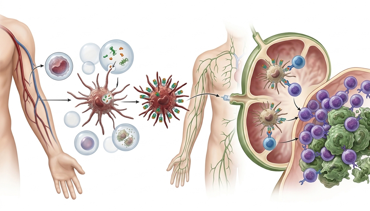The process begins with a blood draw or leukapheresis to collect monocytes. These are then cultured and stimulated to develop into dendritic cells. After 7 days of preparation, the activated dendritic cells are reintroduced to the patient through a vaccination-like procedure.